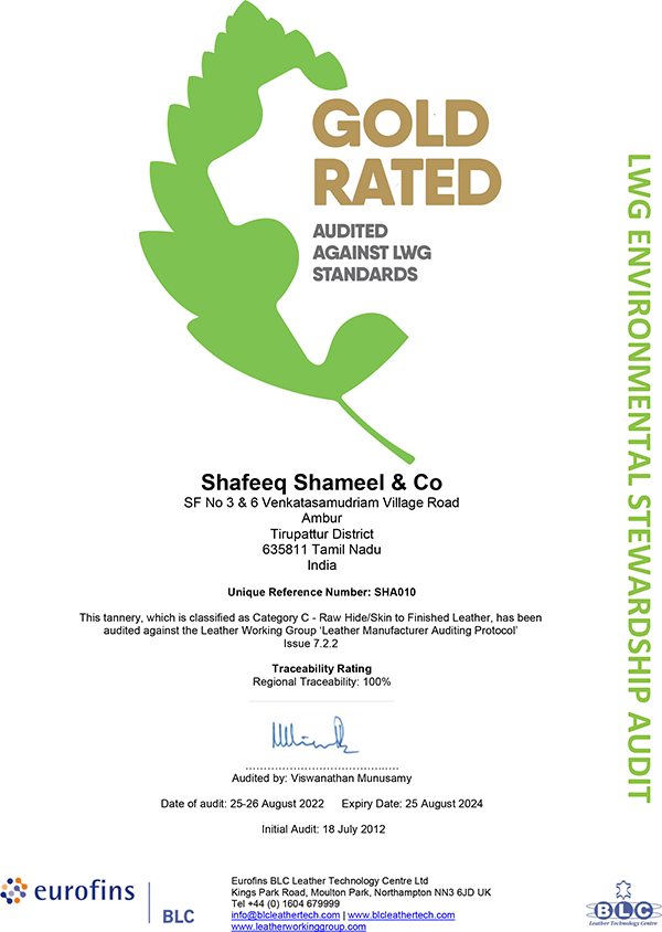 Leather Working Group assesses the environmental performance of leather manufacturing facilities and is the leading certification for the industry. Using these guidelines, we have adopted sustainable and socially responsible practices as detailed below. The periodical audit creates alignment on environmental priorities and brings visibility to the best practices, thus ensuring continual improvement.